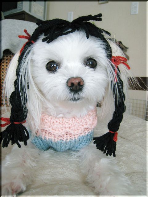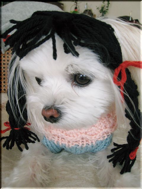 余り毛糸をみつ編みにして、頭に乗っけてみました(爆)