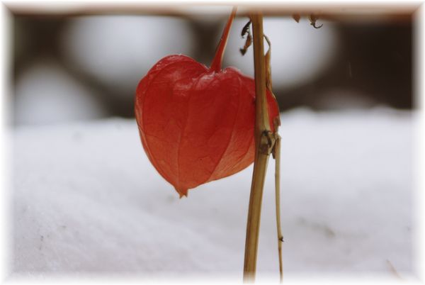 白い世界の中で、まだこのホオズキだけは頑張っています。
