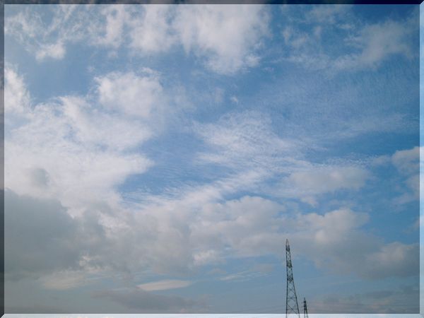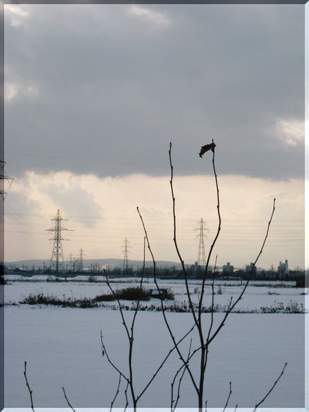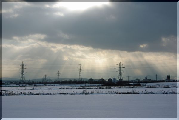 鉄塔の林の向こうに、灰色の雲間から陽が差していました。