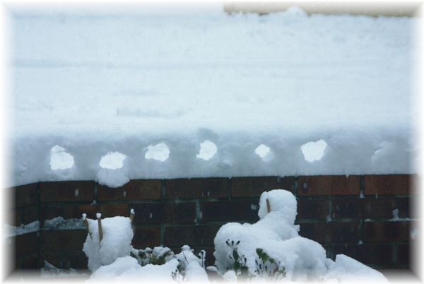 登校中の子供達が、塀の上に積もった雪に穴をあけていったみたいです(笑)