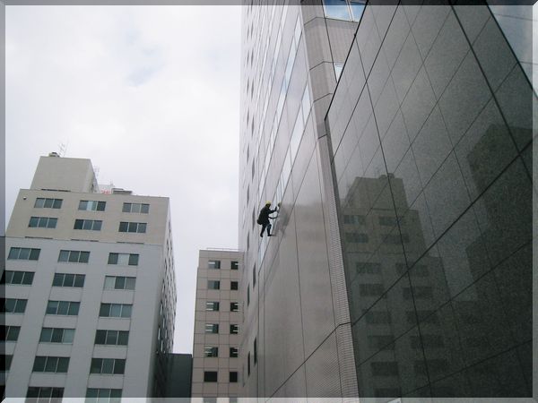 寒風吹きすさぶ中、お一人で窓拭きのお仕事に精を出していたのでした・・・。